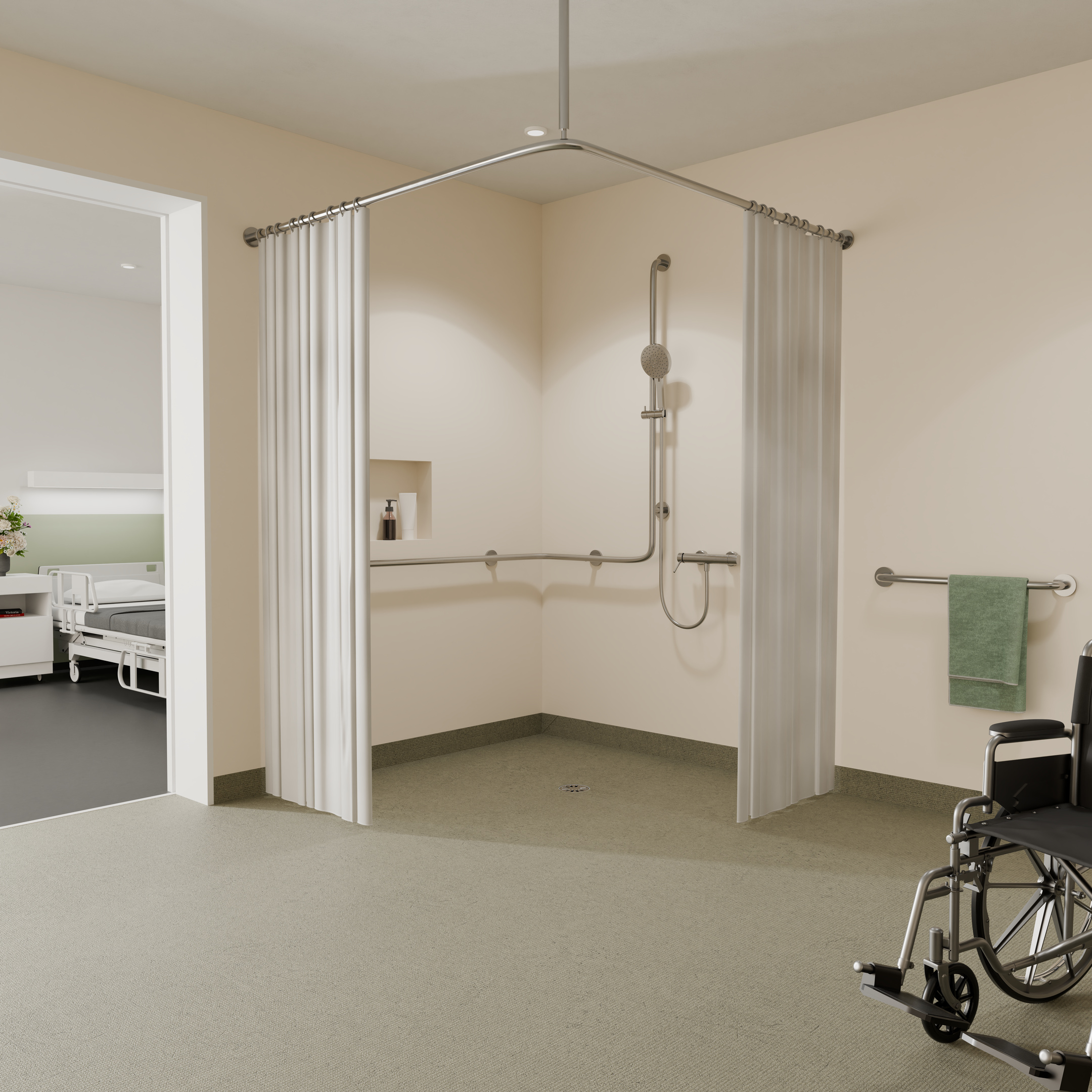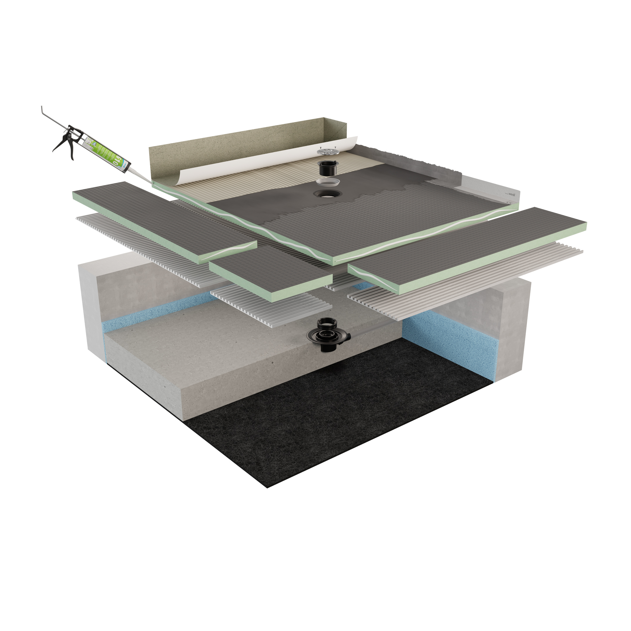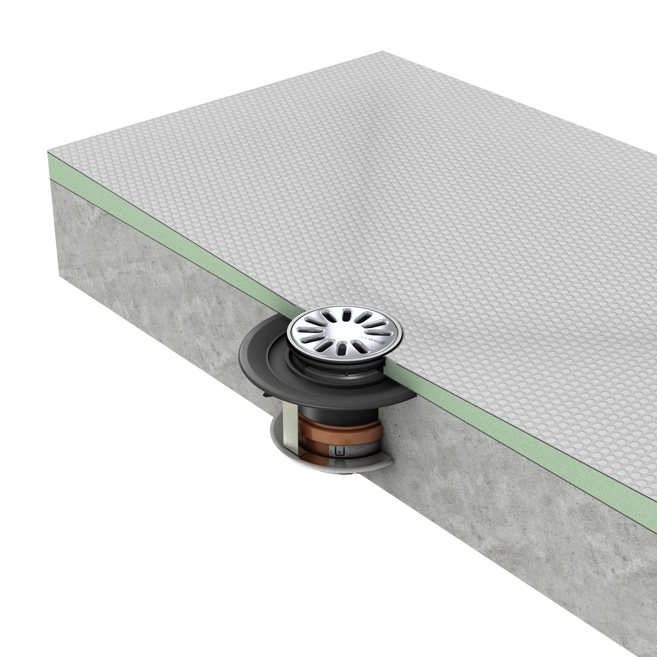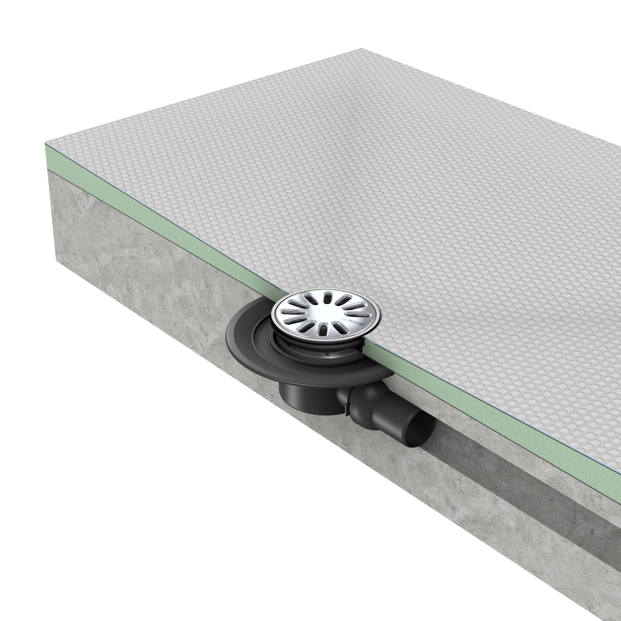 Bruseelementet og tilhørende plader består udelukkende af genanvendt, presseresistent PET-skum og er designet til høje punktbelastninger, såsom kørestole, brusestole eller patientlifte. Samtidig er systemet nemt at arbejde med: Snit kan udføres med alm. sav eller elektrisk, og støvdannelsen er minimal. Afløbs muligheder er enten vandret eller lodret DN50-punktafløb eventuelt med en brandsikringskrave. En 360 graders drejelig afløbsforbindelse, en skæreskabelon og en spændering for sikker PVC-tilslutning sikrer detalje.