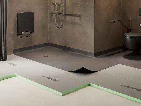 Complementary Fundo extension boards allow the surrounding bathroom floor to be constructed without drying-intensive screed, creating a consistent, waterproof foundation beyond the shower area and completing the fully coordinated Solido system.