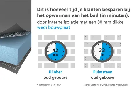 Met het wedi-bouwpaneel kunnen baden effectief en eenvoudig van binnenuit worden geïsoleerd. Het hitteisolerende paneel met XPS-kern is waterdicht en een optimaal substraat voor tegels en andere vloer-, wand- en plafondbekleding zoals wedi Top Wall. Zelfs met een 20 mm dik bouwpaneel kan het warmteverlies met meer dan de helft worden verminderd, afhankelijk van de buitenwand. De energiekosten kunnen met maximaal € 500 per jaar worden verlaagd met een wedi 80 mm dik paneel.